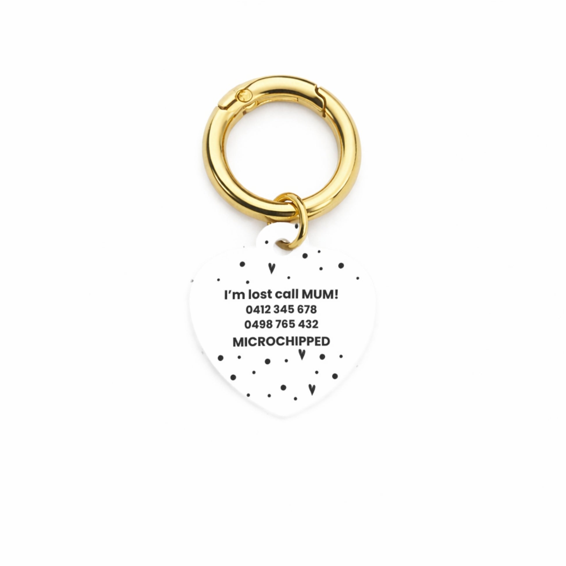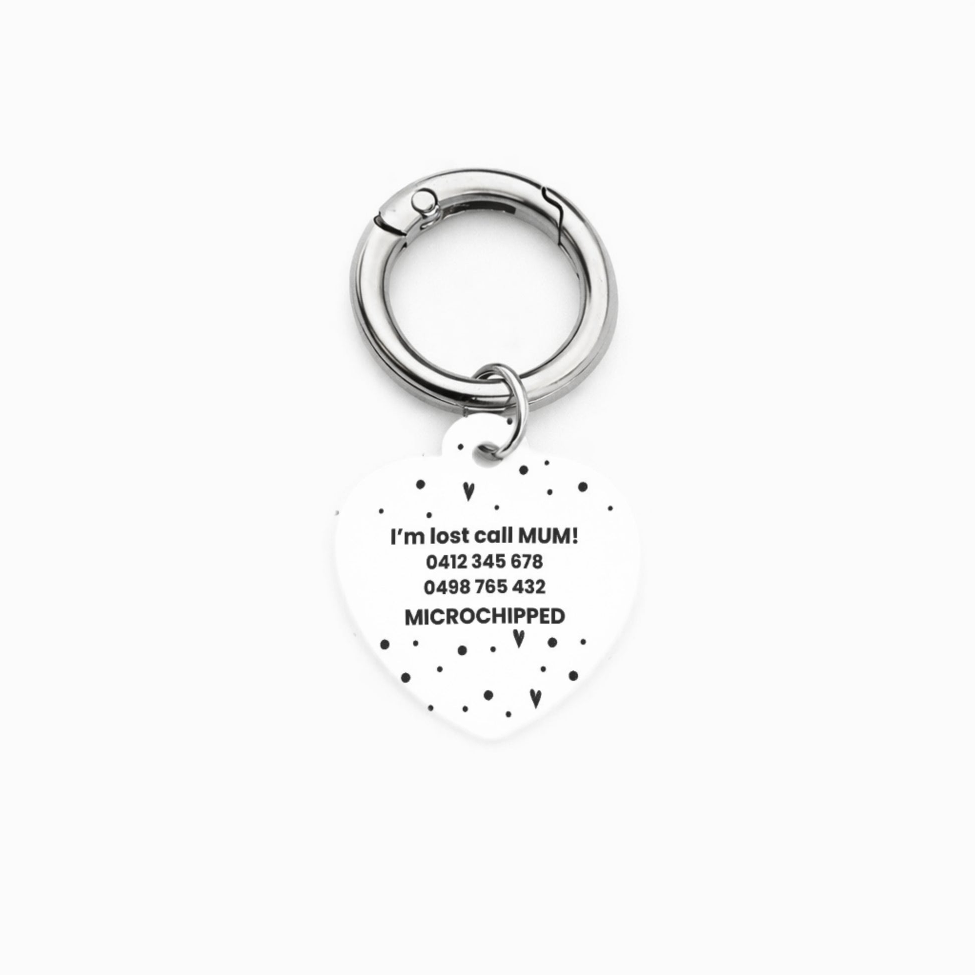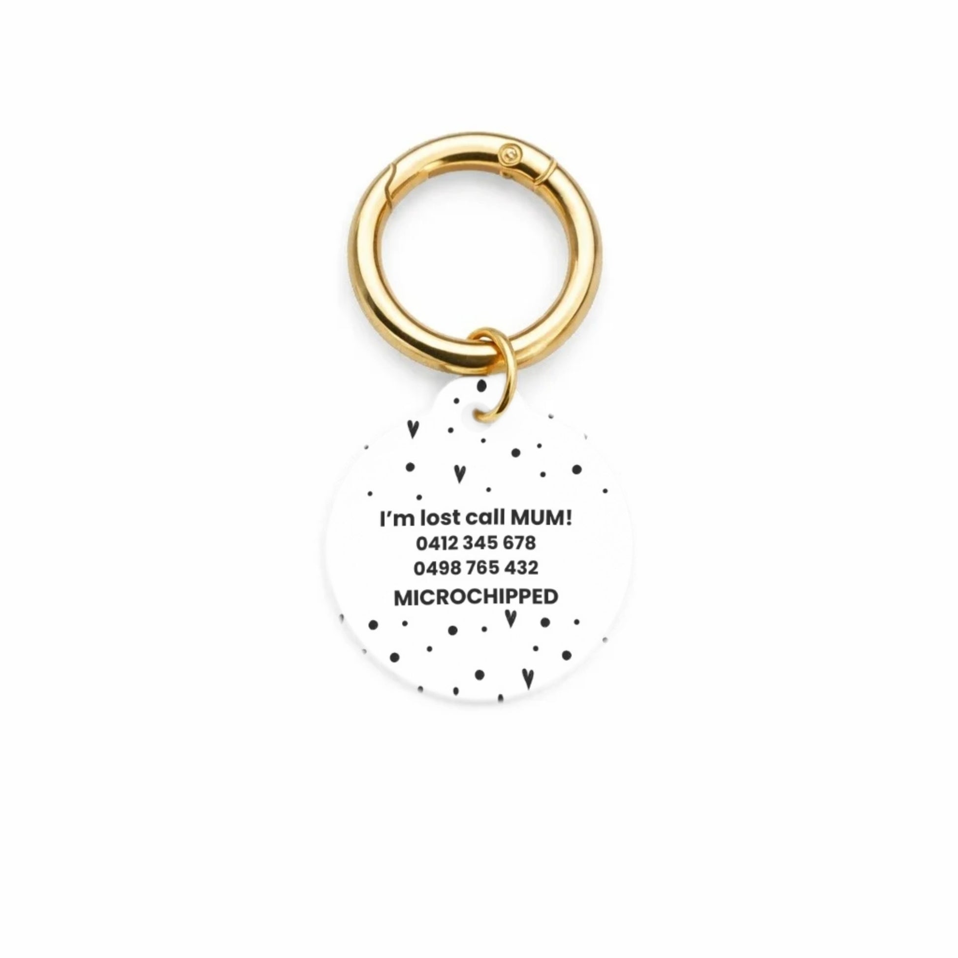The Dottie Pet ID Tag features a playful black-and-white dot pattern with tiny heart details for a fun, modern look. Lightweight and durable for everyday wear, it’s designed to sit comfortably on your pet’s collar while adding a cute touch of personality. Perfect for pets who love a little charm with a classic twist.
