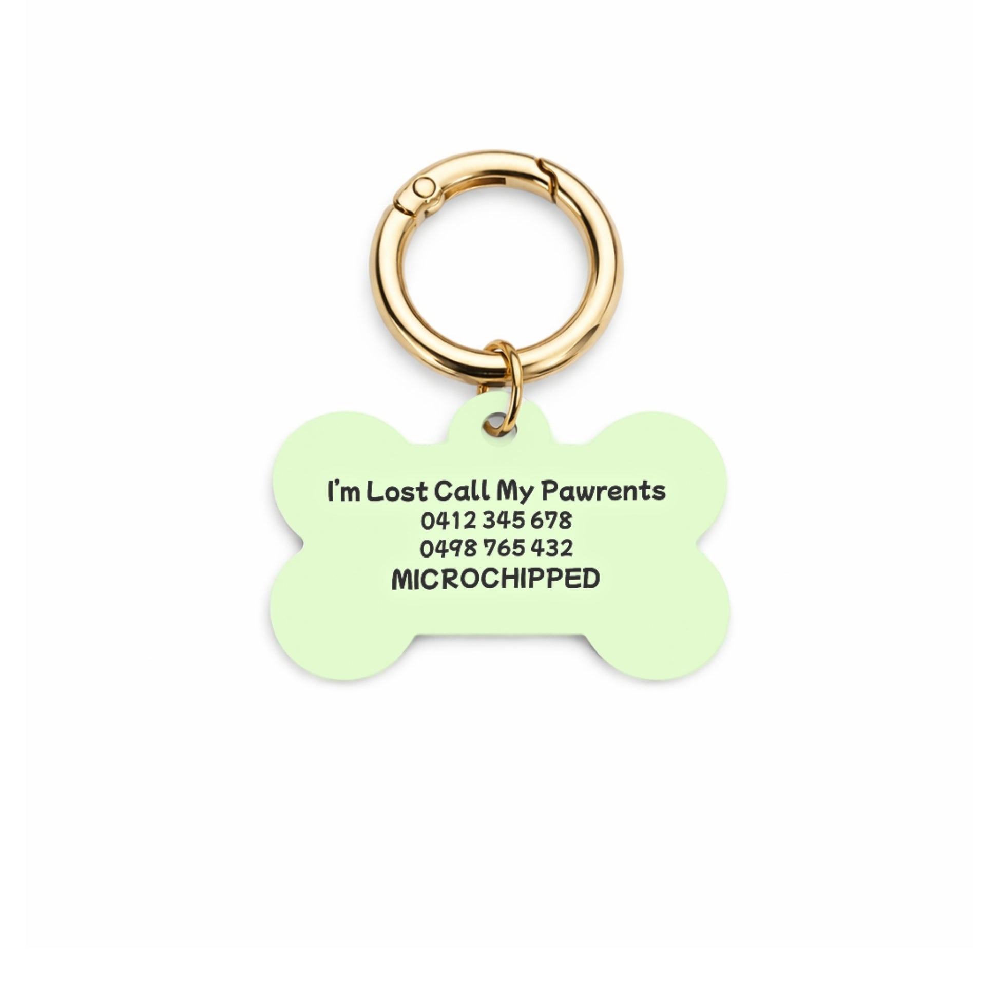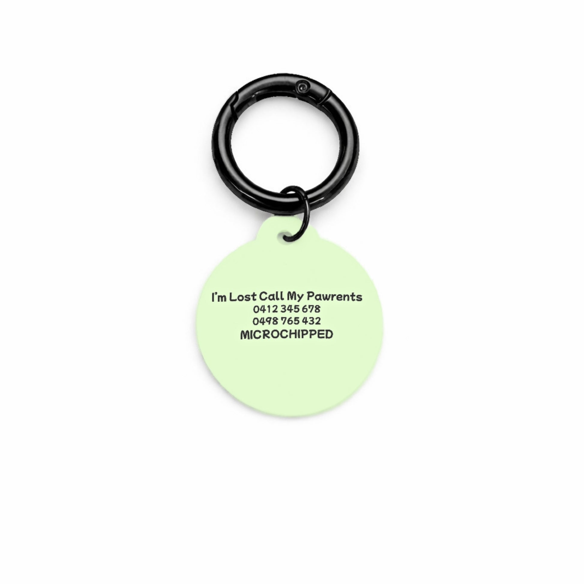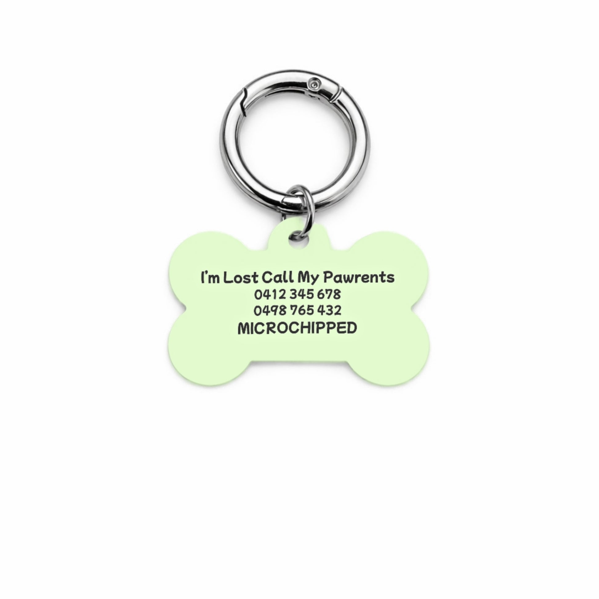 Each tag is fully customisable, with one line of text on the front for your pet’s name, and up to four lines of text on the back. The back can include details such as a contact phone number, microchip information, an additional phone number, or any extra notes you’d like to add for peace of mind.